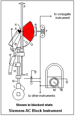 The construction of the instrument is shown diagramatically at the right, in the "blocked" state. If this instrument is at the block entrance, it shows a red vane indicating "Train on Line". It is connected to a similar instrument at the other end of the block, which is in the "unblocked" state, but since the red and white sectors are interchanged on that instrument, also shows a red vane.